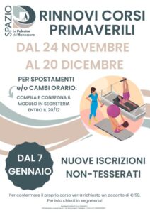 Dal 24 Novembre al 20 Dicembre sono aperti i rinnovi per i corsi primaverili! Puoi rinnovare il tuo abbonamento confermando…